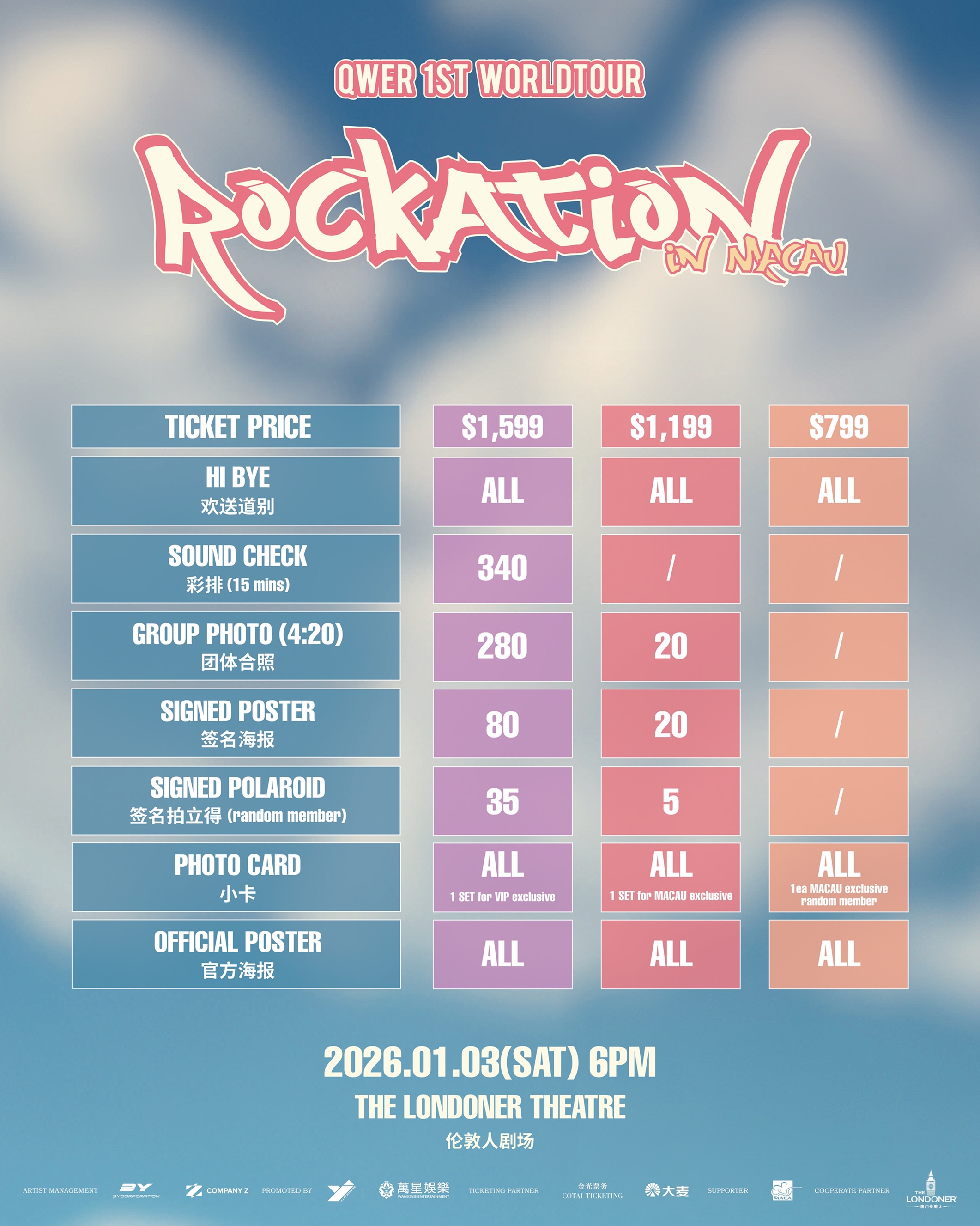 准备迎接激动人心的夜晚!QWER首场世界巡演登陆澳门,将以他们独特的摇滚音浪和爆发性的舞台能量点燃全场。不容错过!